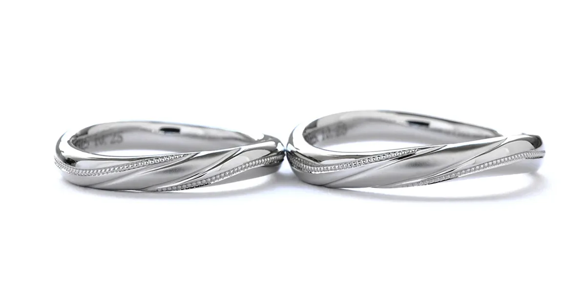 指輪の曲線とうまく交わるように斜めにミルグレインを施したデザインで、人気なウェーブデザインの結婚指輪によく馴染みます。